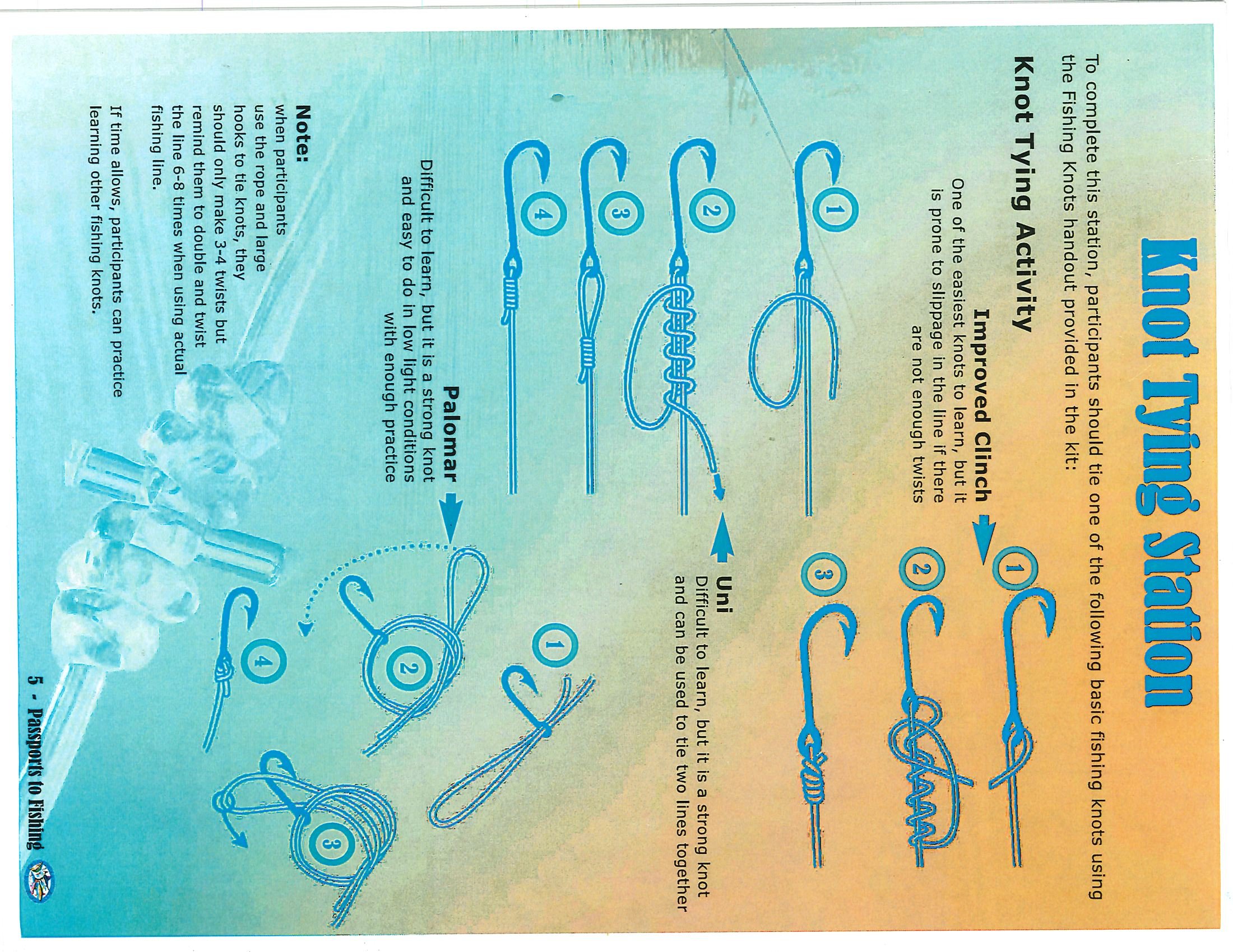 Volunteers will teach kids basic fishing knots (e.g. improved clinch, uni, palomar).