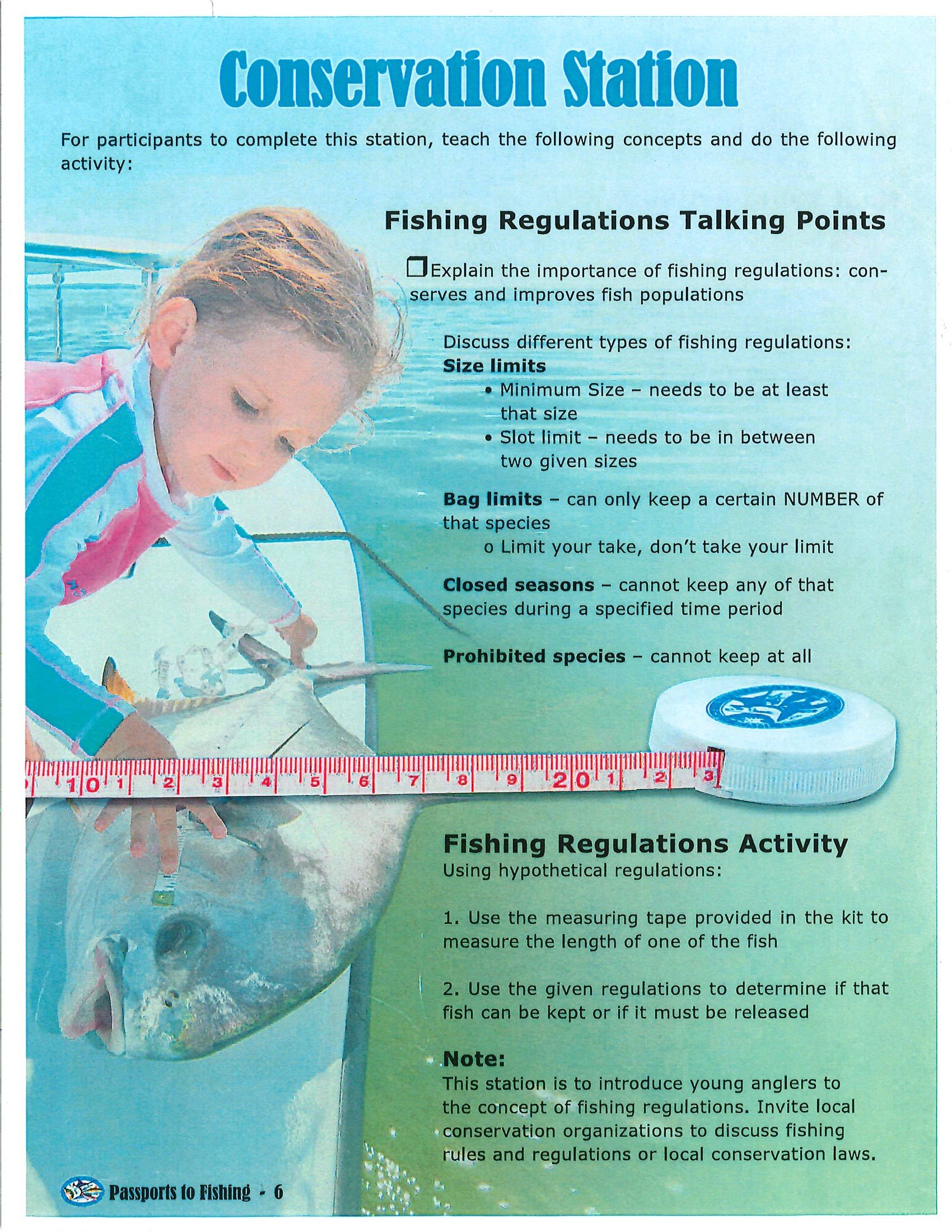 Volunteers will teach kids about fishing regulations (e.g. size limits, bag limits, closed seasons, prohibited species).